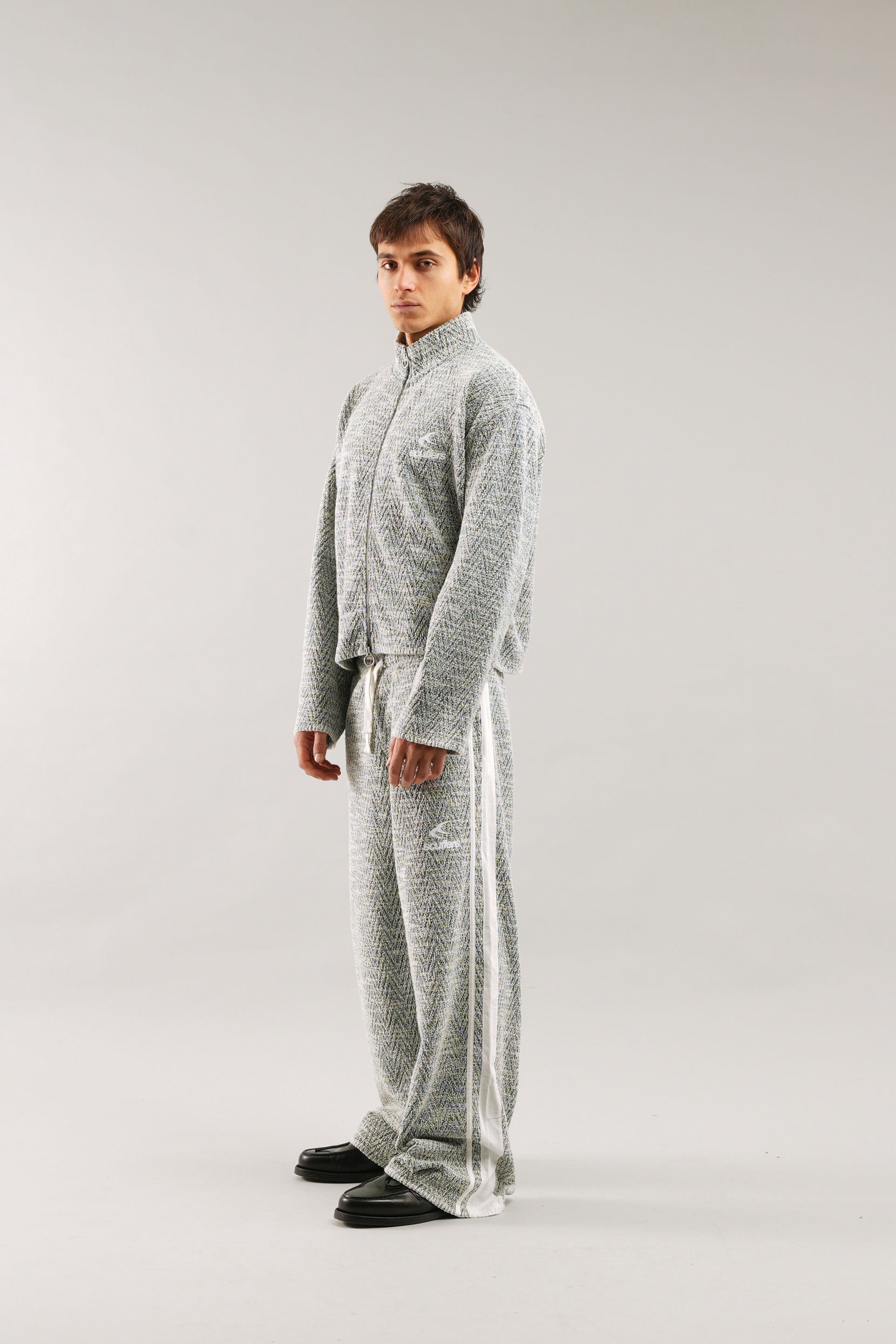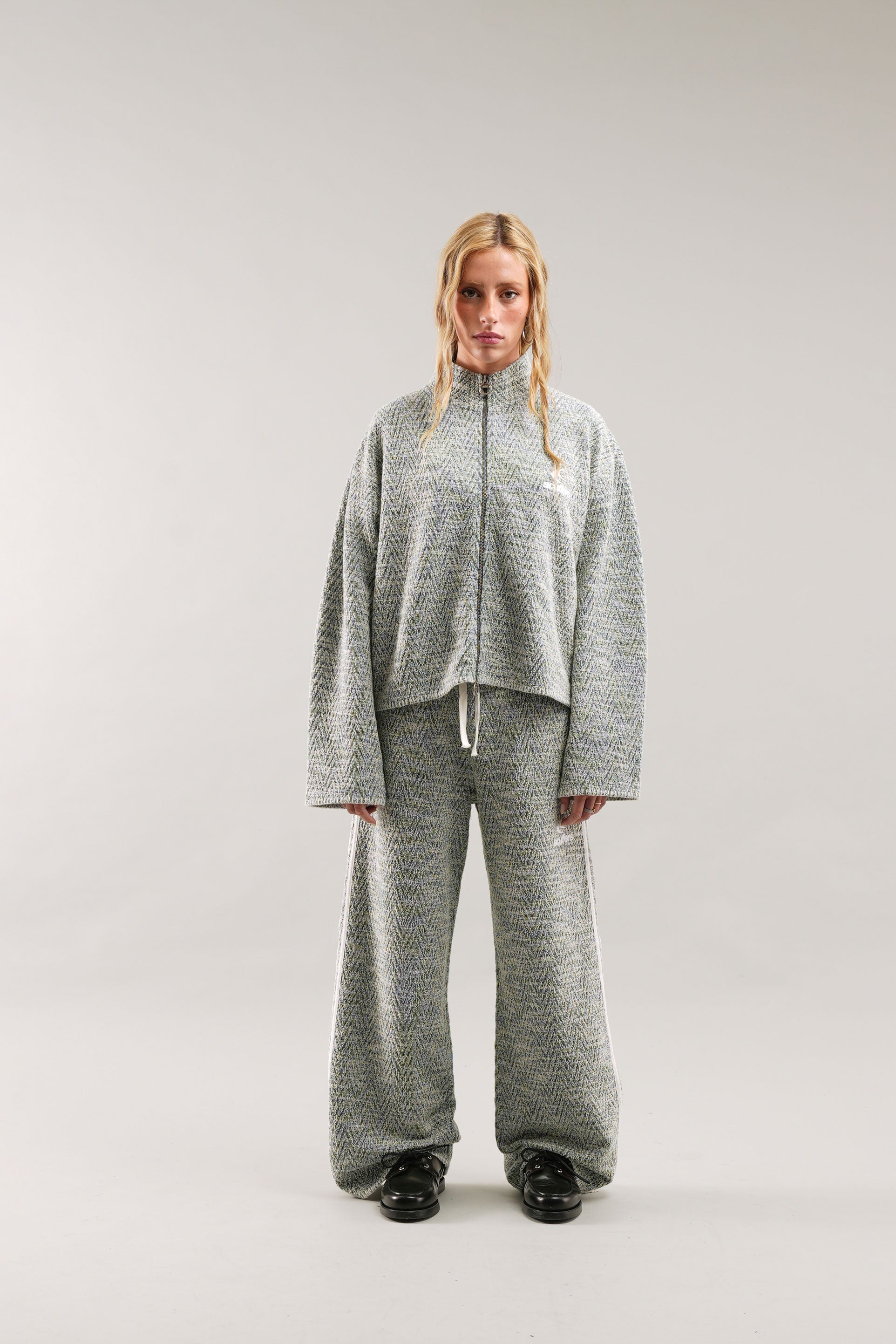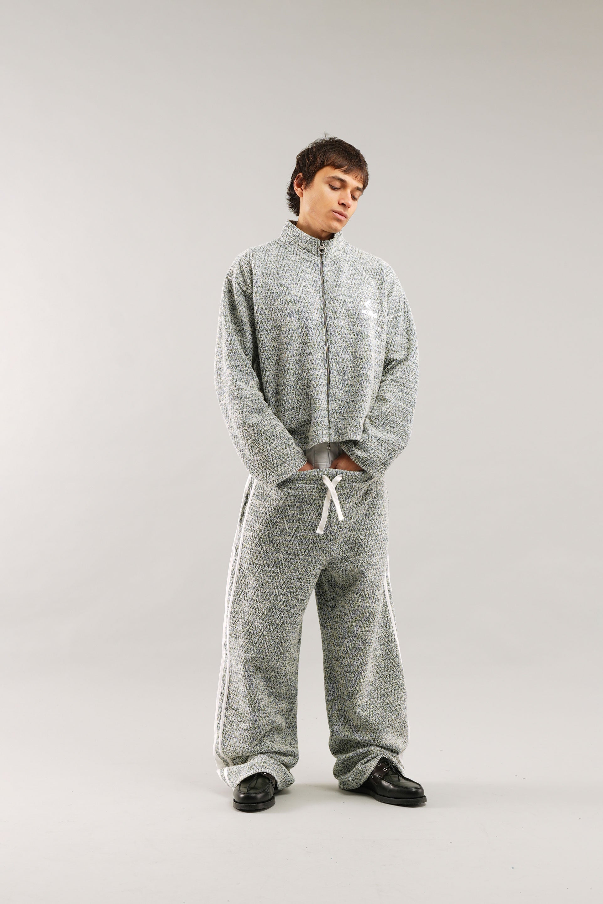 Chaqueta con cremallera y diseño de espiga, confeccionada en tejido texturizado con un clásico estampado de chevrones. Presenta cierre de cremallera completa con tirador de anilla, cuello alto y corte holgado. Logotipo de Scuffers bordado en el pecho. Largo corto para una silueta moderna.