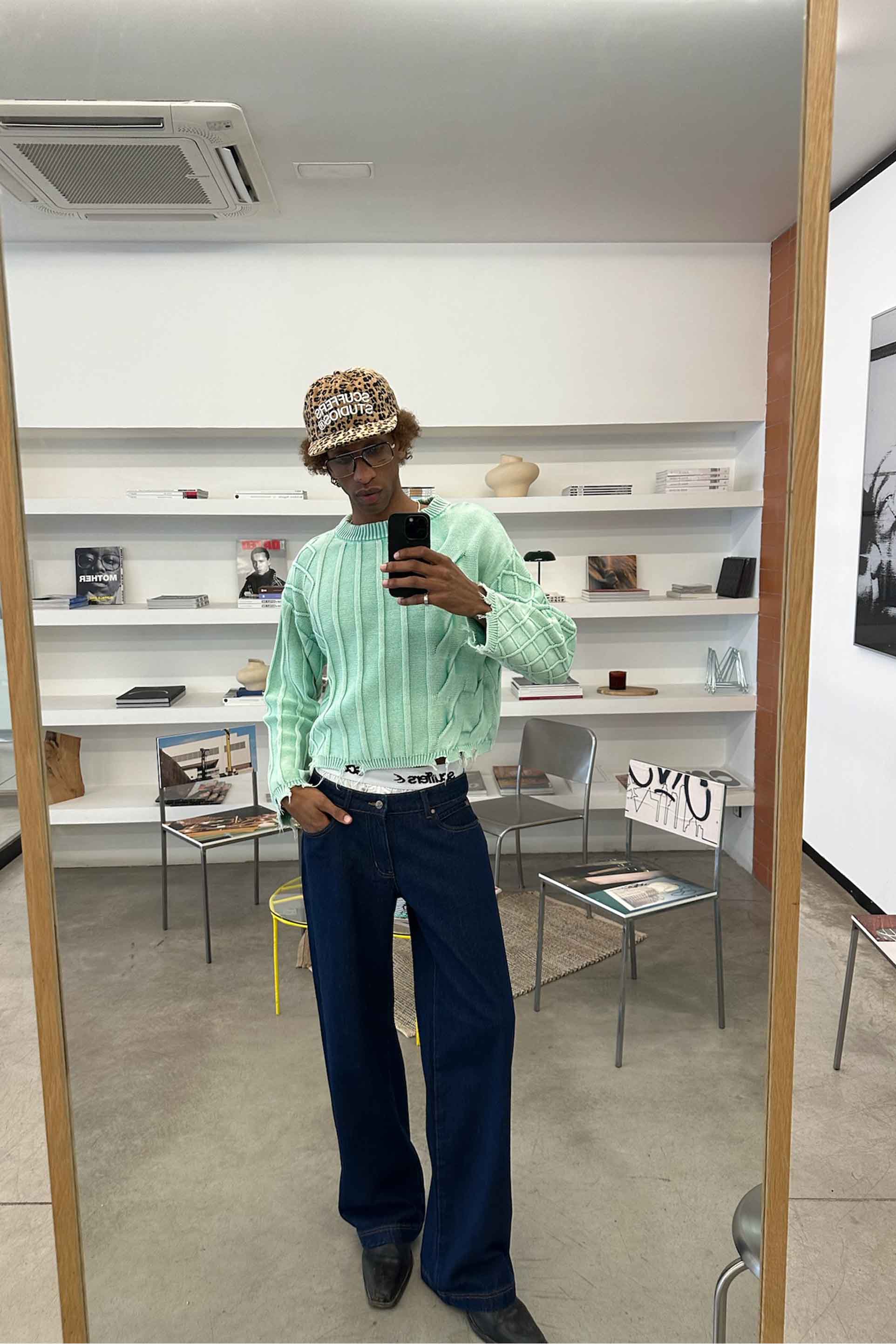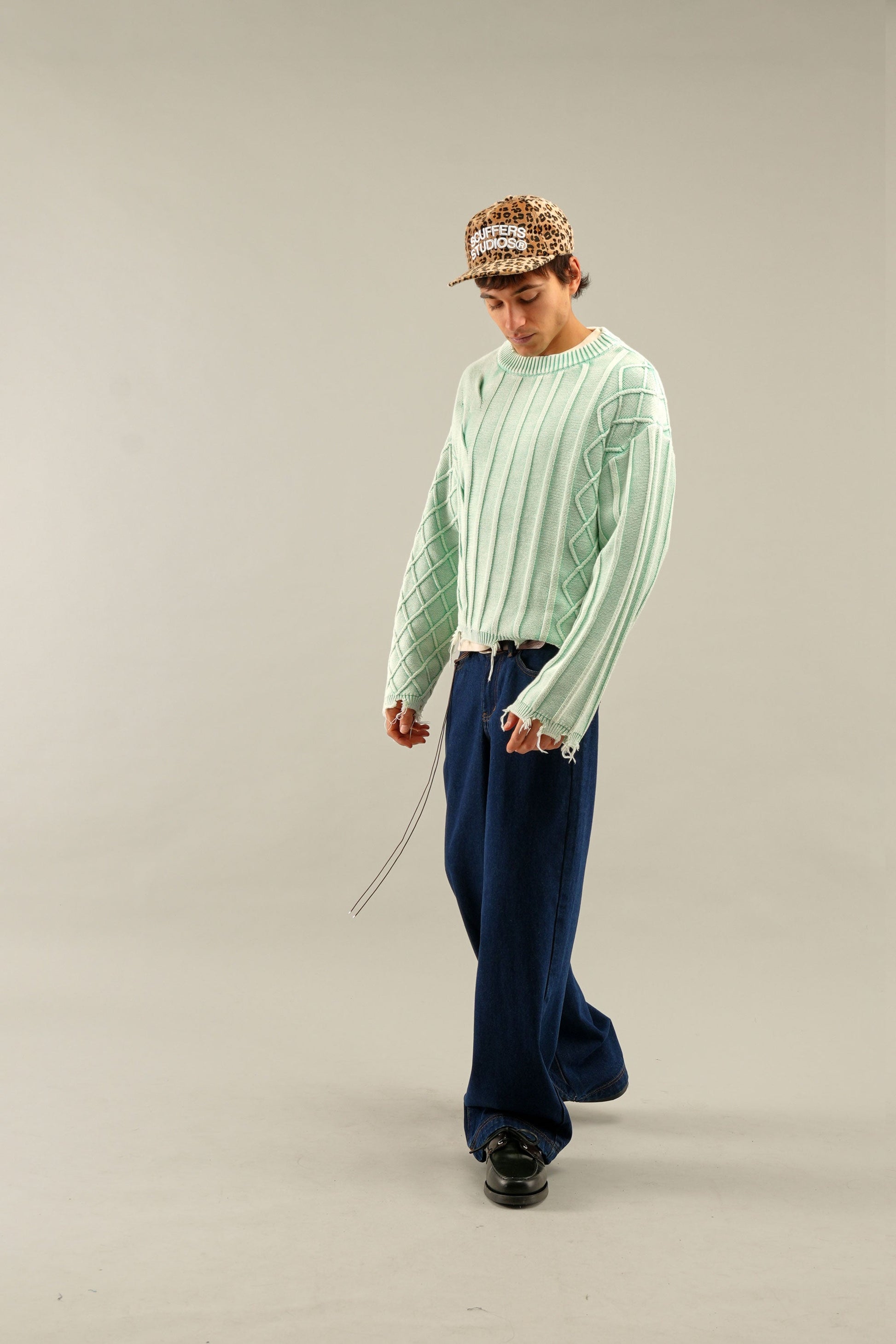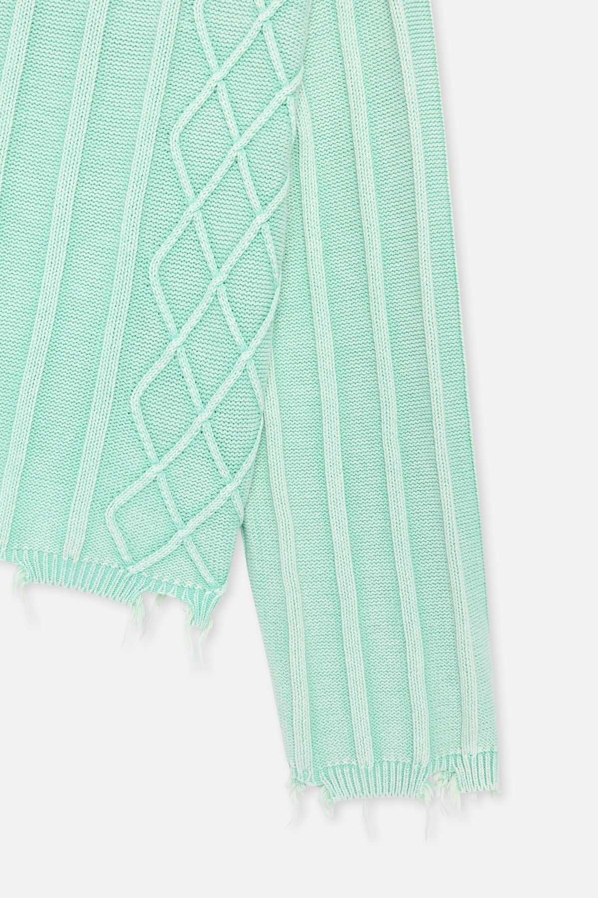 Punto desgastado en verde menta descolorido con una combinación de patrones de ochos y canalé. Confeccionado en tejido suave de grosor medio con un corte holgado. Presenta bordes sin rematar en el bajo y los puños para un aspecto desgastado. Cuello redondo acanalado y un sutil detalle de logotipo metálico en la espalda.