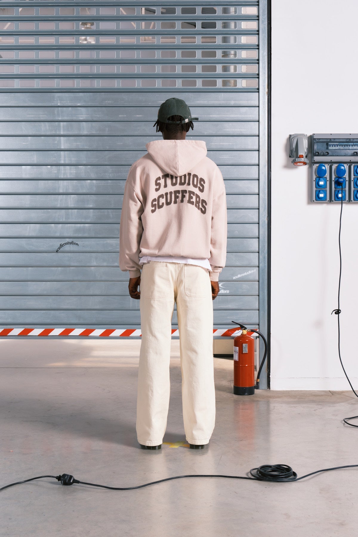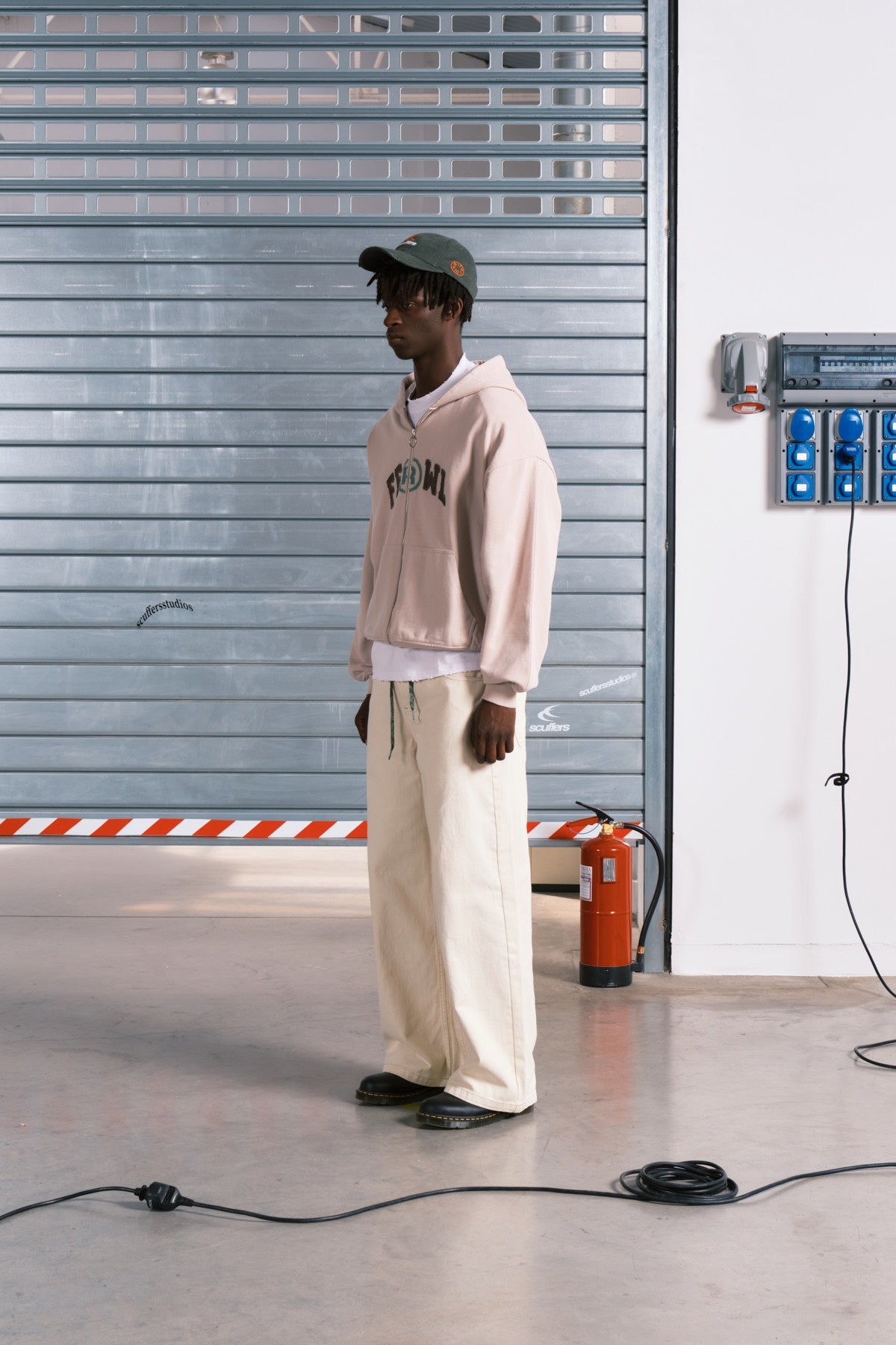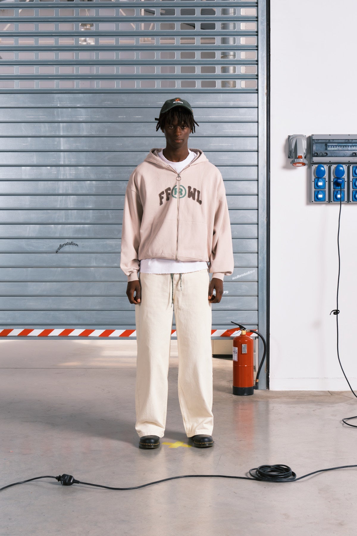 Sudadera con capucha, corte cuadrado y cremallera, de color crudo. «FF» bordado en verde bosque en el lado derecho de la cremallera y WL bordado en el lado izquierdo. «Scuffersstudios» bordado en la espalda.
