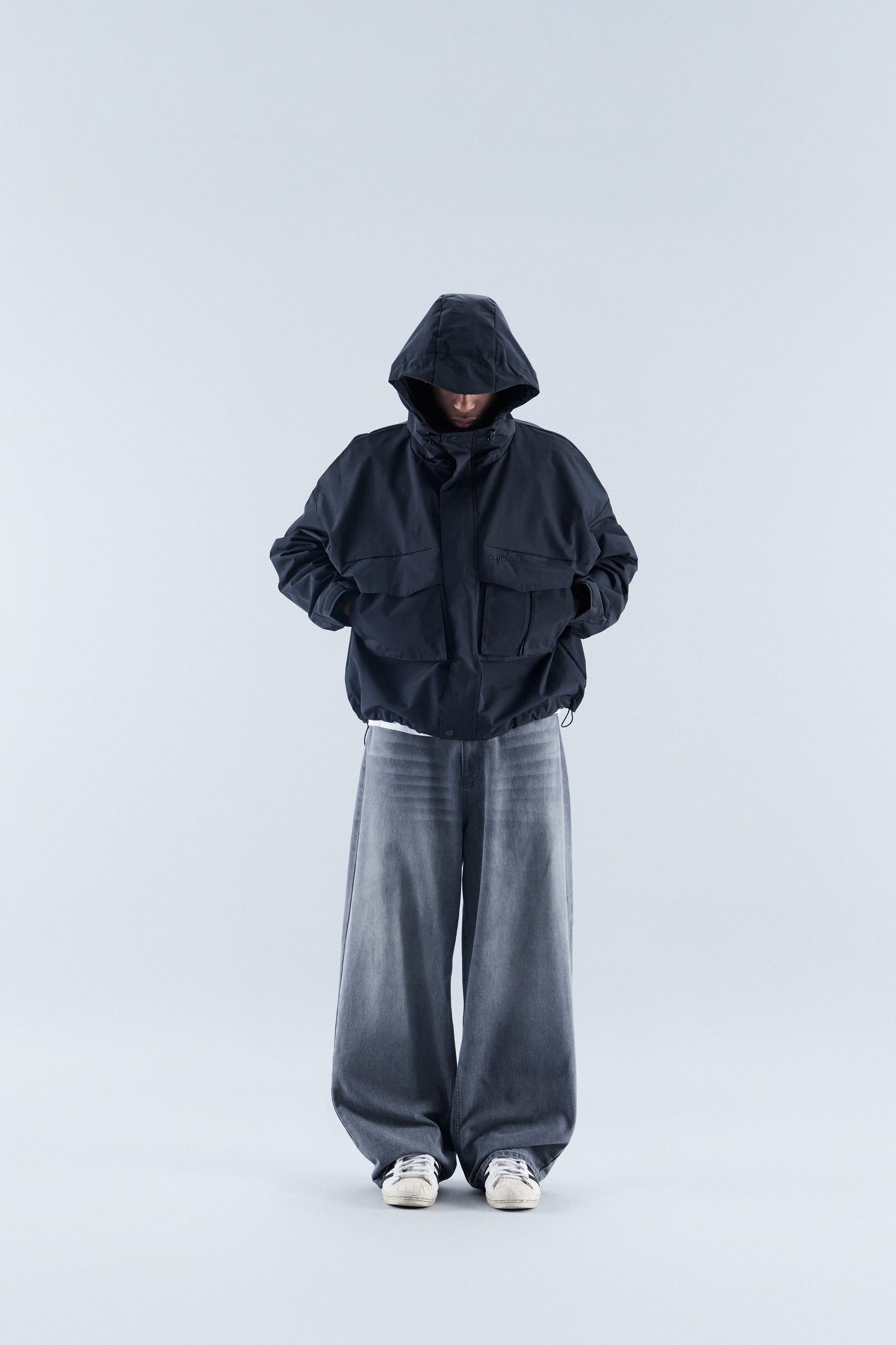 Abrigo de nailon negro, de corte corto y hombros caídos, con cremallera oculta y botones en cada extremo. Capucha, cintura y puños ajustables. Un bolsillo con cremallera debajo del bolsillo multiusos, a cada lado de la cremallera. Resistente al agua y al viento.
